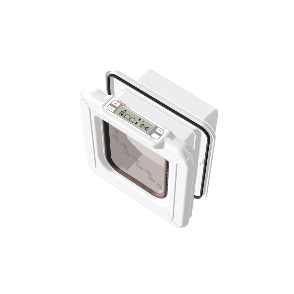 Zamanlayıcı veya 4 pozisyonlu döner kilit aracılığıyla kedilerinizin ne zaman dışarı çıkabileceğine karar verebilirsiniz. Cereyanı önlemek için, kedi kapısının boyunca hava koşullarına dayanıklı bir fırça kenarı takılıdır.