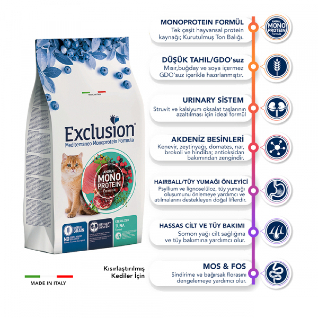 Exclusion Monoprotein Ton Balıklı ve Narlı Düşük Tahıllı Kısırlaştırılmış Kedi Maması 12kg