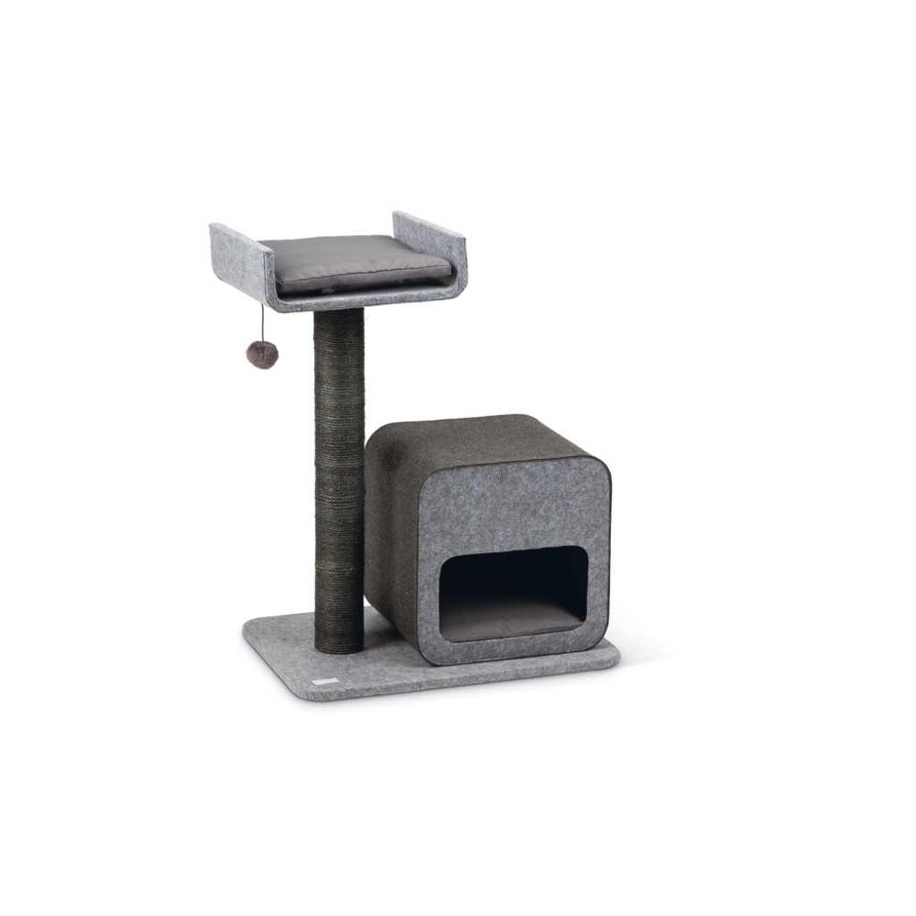Fonksiyonel yerleşimi ve modern tasarımıyla kedi evi, kedinizin oyun, dinlenme ve tırmalama ihtiyaçlarını tek bir yapı içinde karşılamak üzere tasarlanmıştır.