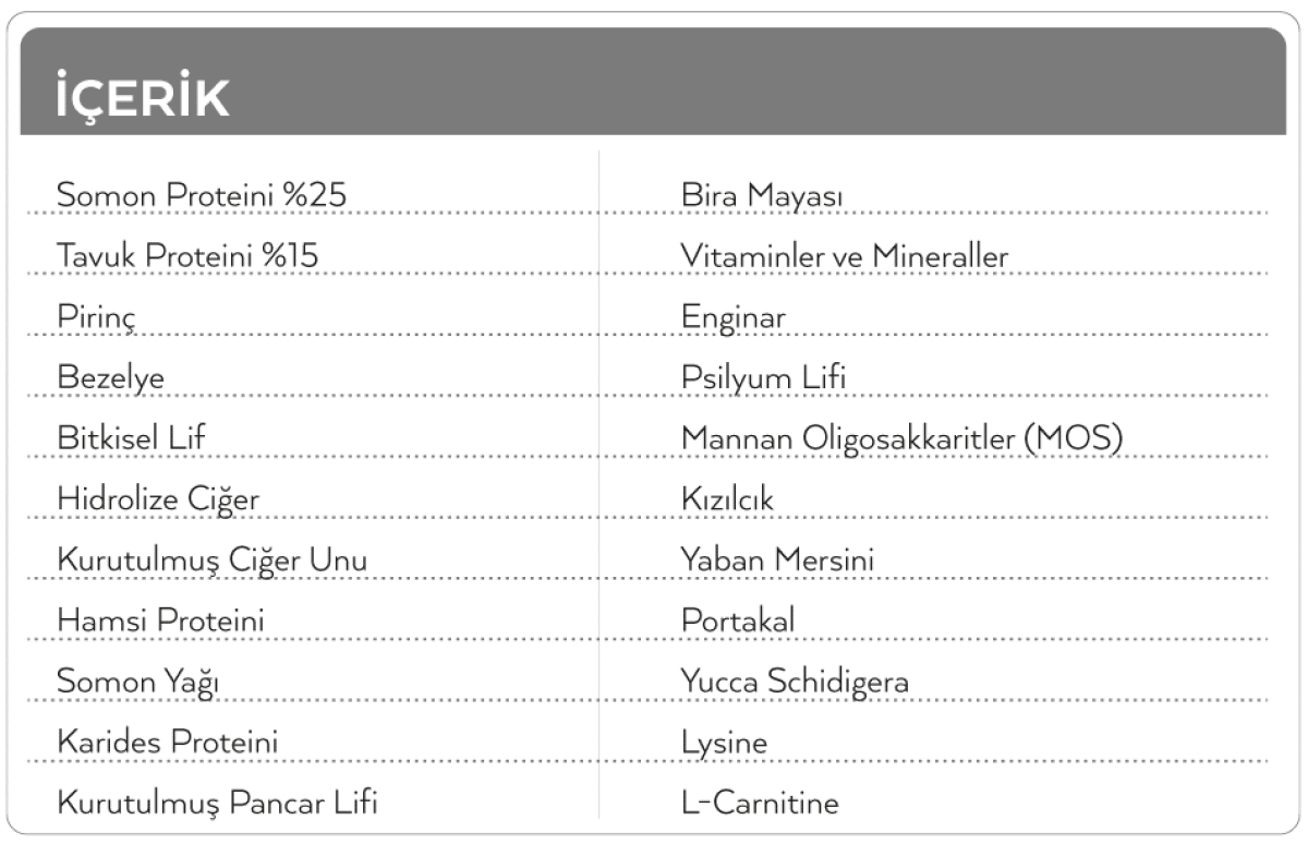 Formülündeki %37 proteinin %75'i somon ve diğer hayvansal kaynaklardan gelir.