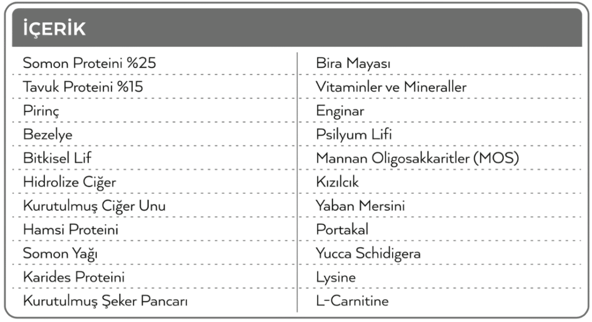 Formülündeki %37 proteinin %75'i somon ve diğer hayvansal kaynaklardan gelir.