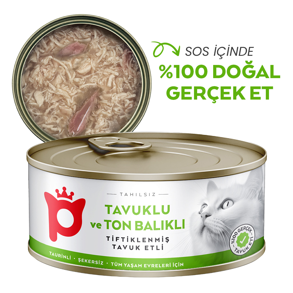 Petlebi Sos İçinde Tiftiklenmiş Taze Tavuk Etli ve Ton Balıklı Kedi Konservesi 70gr