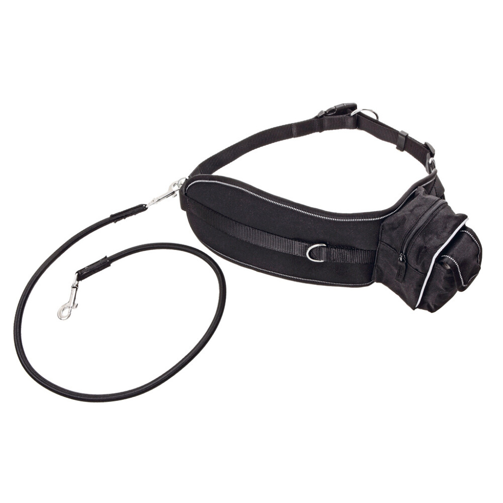 Köpekler ile koşmak için özel olarak tasarlanmış spor kemeri 1 metre uzunluğunda esnek bir tasma ile birlikte gelir; bu tasma döner ve kolayca takılabilen D halkaları içerir.