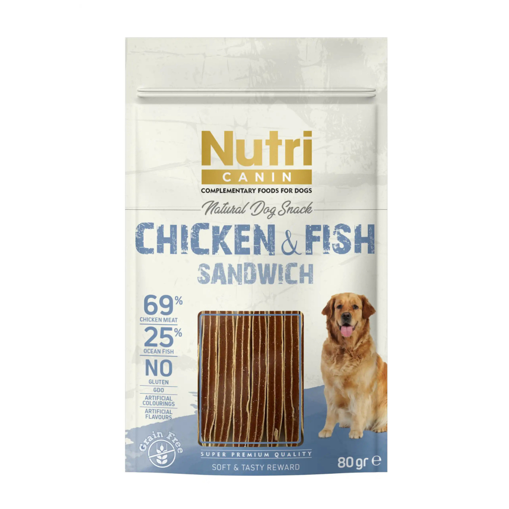 Nutri Canin %25 Okyanus Balıklı ve %69 Tavuk Etli Tahılsız Sandviç Köpek Ödül Maması 80gr