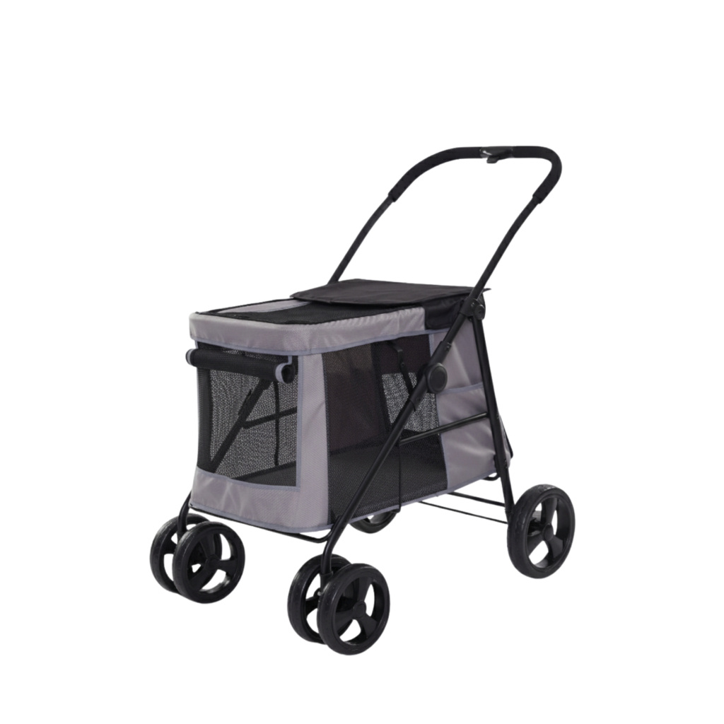 Tommy Evcil Hayvan Arabası, 102x62x105 cm boyutlarındaki geniş iç hacmi ve şık gri tasarımıyla orta ve büyük boy evcil hayvanlar için üst düzey bir konfor sunar.