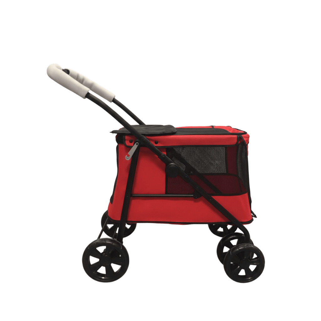 Tommy Evcil Hayvan Arabası, 102x62x105 cm boyutlarındaki geniş iç hacmi ve şık gri-kırmızı renk seçenekleriyle orta ve büyük boy evcil hayvanların konforu için özel olarak tasarlanmıştır.